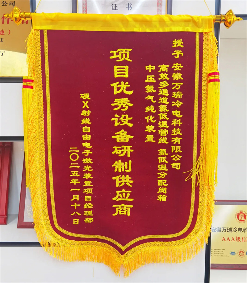近日,硬 X 射線自由電子激光裝置項目(英文簡稱為“SHINE”)2024 年度供應商大會在上海科技大學報告廳舉行,安徽萬瑞冷電科技有限公司作為優秀供應商應邀出席,榮膺硬X射線自由電子激光裝置“項目優秀設備研制供應商”榮譽稱號!