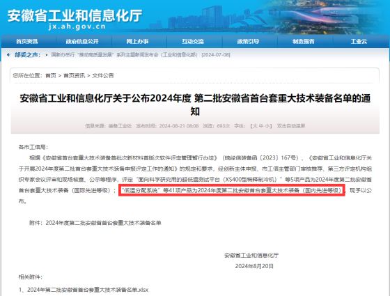 近日,安徽省工業和信息化廳發文公布了2024年度第二批安徽省首臺套重大技術裝備名單,萬瑞公司研制的“低溫分配系統”名列其中,榮獲安徽省國內先進首臺套重大技術裝備認定。